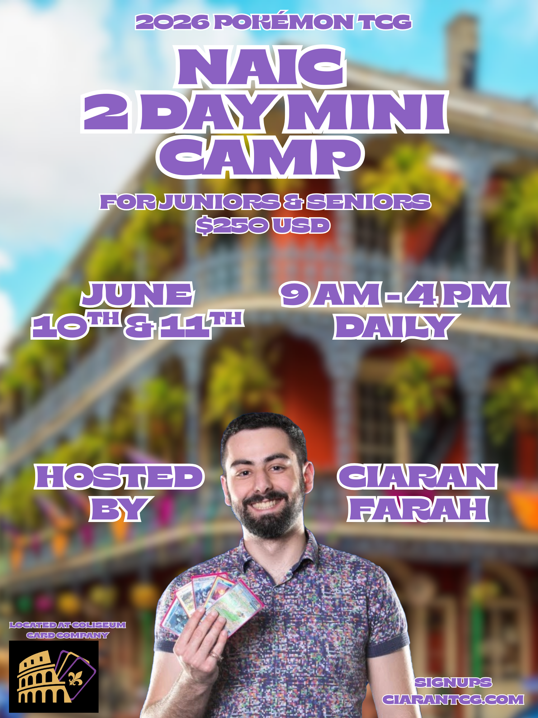 Join me this June, just before the Pokémon North American International Championships (NAIC), the largest tournament of the year, for an exclusive 2-day mini camp designed for Juniors & Seniors competing at NAIC! Held at the Coliseum Card Company, located just 15 minutes away from the Ernest N. Morial Convention Center, this program will be led by myself alongside several world-class players joining as special guest coaches.